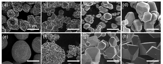 圖7 (a)商業(yè)化NCM523;(b)KCl/800℃;(c)KCl/900℃;(d)KCl/1000℃;(e)共沉淀氫氧化物前驅(qū)體;(f)NaCl/800℃;(g)NaCl/900℃;(h)NaCl/1000℃。