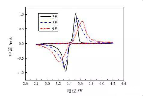 圖 10為各樣品的循環(huán)伏安性能曲線,3#、8#、9#分別為160°C、90°C 、20°C條件下輥壓極片制作的電池。由圖可見實驗樣品中當軋制溫度為 160°C 時,向上的氧化峰與向下的還原峰對稱性較好,峰位差也最小,充電和放電的可逆性也最好,證明庫侖效率必然也高。(劉斌斌. 動力鋰離子電池極片精密制造理論與實驗研究[D]. 太原科技大學, 2017.)