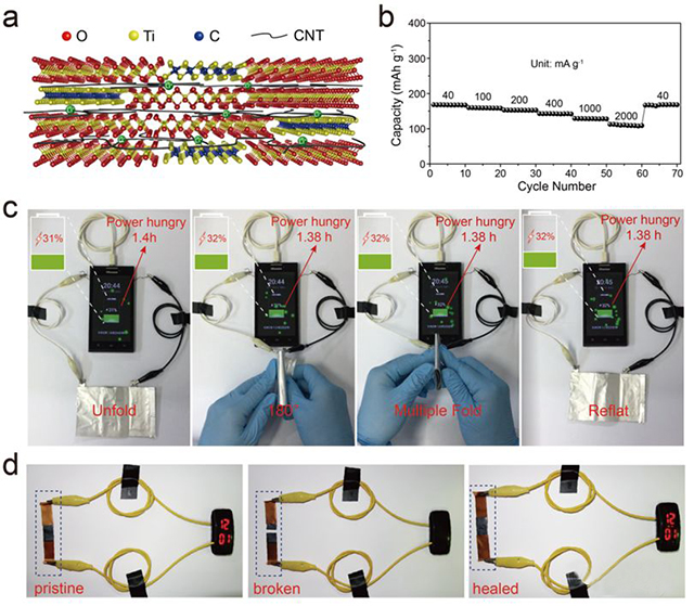 圖一:(a) 所制備的復合膜電極中titania和Ti3C2片層堆垛示意圖;(b) 電流密度40mA/g至2000mA/g范圍內(nèi)復合膜電極的倍率性能;(c) 兩個串聯(lián)的軟包電池在不同形變時給智能手機穩(wěn)定充電;(d) 電池切割前后和自修復后為電子手表供電。