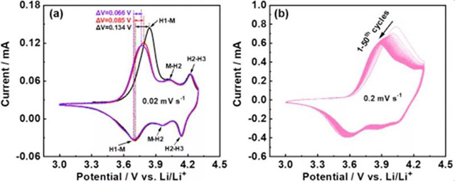 圖3:循環(huán)伏安法(電壓范圍在3.0 V至4.3V)。a)以0.02 mV s-1的掃描速率進行三個循環(huán);b)50個連續(xù)的CV循環(huán),掃描速率為0.2 mV s-1。