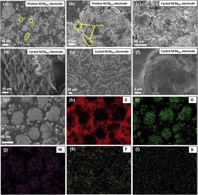 圖6. a,b)原始狀態(tài)下NCM811電極形態(tài),c)包含SI10-05-70%PC電解質(zhì)NCM811電極形態(tài);d-f)剝?nèi)ヤX集電器后的NCM811電極的底層。g)循環(huán)后(頂層)NCM811電極的SEM顯微照片和h–l)EDX元素分布。